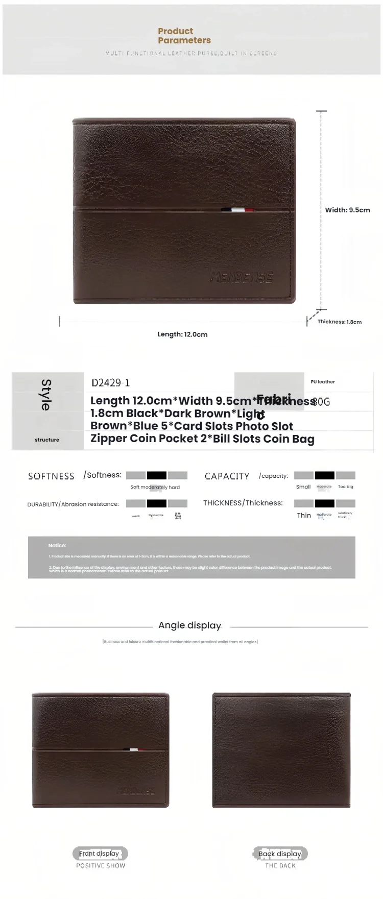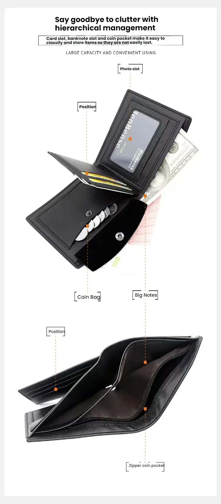 Interior: Interior Slot Pocket,Interior Zipper Pocket,Interior Compartment,Zipper Poucht,Coin Pocket,Note Compartment,Photo Holder,Card Holder