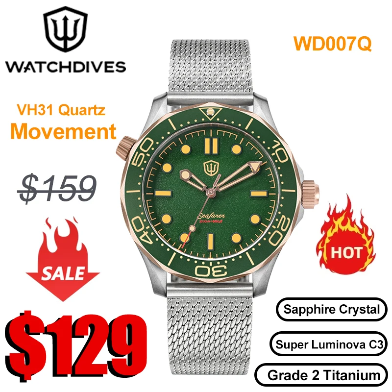 Watchdives WD007 Automatic Watch NH35/NH38 Movement 007 NTTD Wristwatch Domed Sapphire Crystal Solid Bracelet C3 luminous Watches